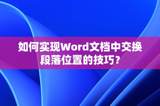 最佳答案1、打开Word文档,定位到需要交换位置的段落。2、点击该段落,当鼠标指针变成四向箭头时,按住鼠标左键。3、拖动鼠标到目标位置,释放鼠标左键,即可完成段落位置的交换。1、选择需要交换位置的段落。2、按下“Ctrl + X”剪切选中的段落。3、定位到目标位置,按下“Ctrl + V”粘贴段落。4、删除......