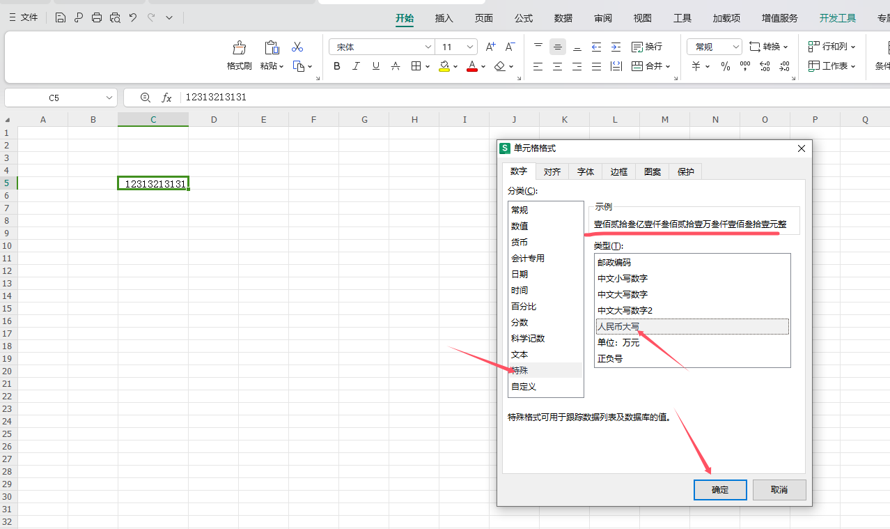 第三步:在【分类】中选择【特殊】后,在【类型】中选择人民币大写,单击【确定】按钮完成。