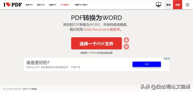 最佳答案02. small PDF在线网站:<u>https://smallpdf.com</u>颜值控应该会喜欢这一款,页面简洁,选择【PDF to WORD】,会出现如下图所示的页面,点击【选择文件</......