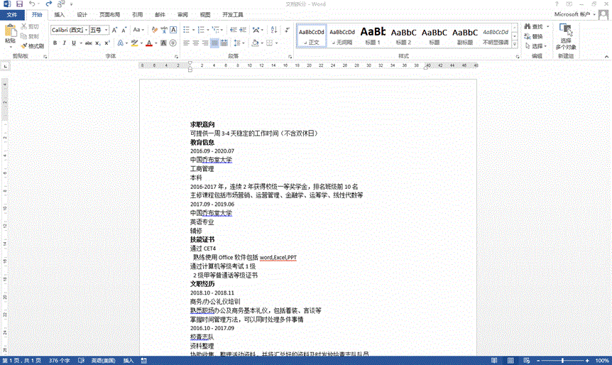 文档拆分呢?是将一篇文档拆分成若干个部分,每个部分独立成为一个文档。下面就以一篇简历为例进行演示。
