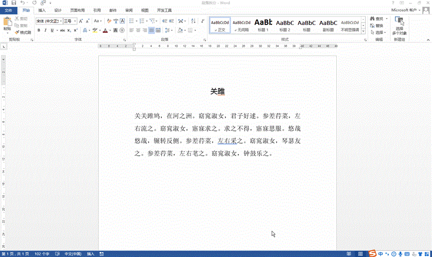 首先来看看段落拆分。我们以这一篇《关雎》为例,我们希望每一个句号都能分成一个段落,即在每个句号后面添加一个段落标记。我们在前面分享过段落标记的表达方式是^p,因此这个地方我们只需要将“。”替换成“。^p”就可以了。