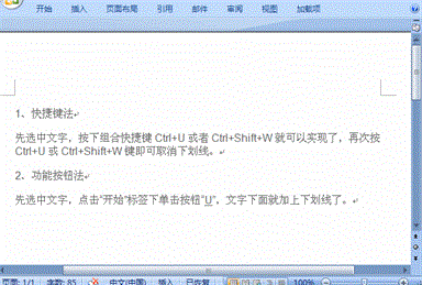 最佳答案1、快捷键法先选中文字,按下组合快捷键Ctrl+U或者Ctrl+Shift+W就可以实现了,再次按Ctrl+U或Ctrl+Shift+W键即可取消下划线。2、功能按钮法先选中文字,点击“开始”标签下单击按钮“U”,文字下面就加上下划线了。<p class="pgc......