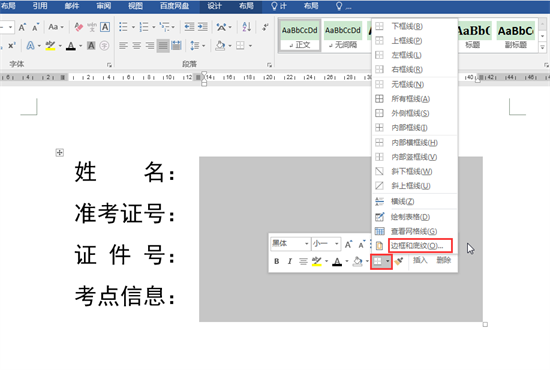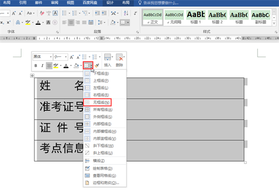 2.选中整个表格,在弹出的浮动工具栏中单击”边框”按钮右侧的倒三角,在下拉列表中选择”无框线”,取消所有表格框线。