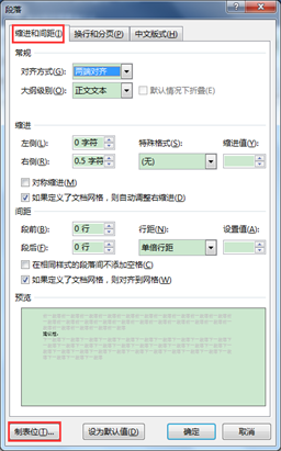 2.在弹出的”段落”对话框中,在”缩进和间距”选项卡下,单击左下方的”制表位”按钮。
