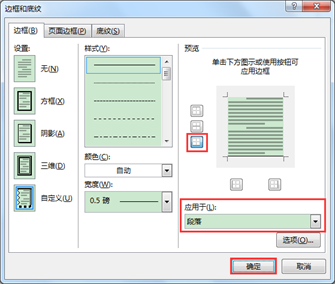 4.在弹出的”边框和底纹”对话框中,在右侧的”预览”区域单击”下框线”按钮,在”应用于”下面选择”段落“,最后单击”确定”按钮。返回文档,我们想要的整齐的下划线就出现了。