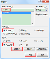 3.在弹出的”制表位”对话框中,在”制表位位置”编辑框中输入适当的数值,这里输入”46字符”,将”对齐方式”设为”左对齐”,”前导符”选择”4___(4)”,单击”设置”按钮,再单击”确定”按钮。