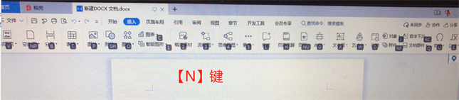 二、然后直接按键盘上的【N】键,这时就会自动切换到【插入】选项卡,同时下方功能区的各个功能按钮上也都出现了英文字母;