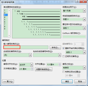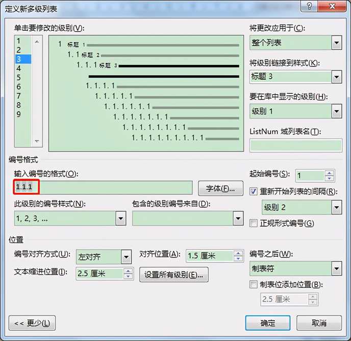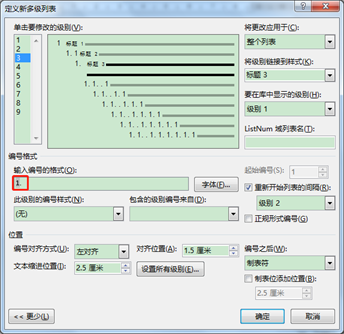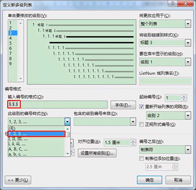 4. 在“此级别的编号样式”编辑框下拉列表中选择想要的3级编号样式,这里选择“1,2,3,…”,此时“输入编号的格式”编辑框中的内容会变为“1.1.1”,恢复成了原先的样子。