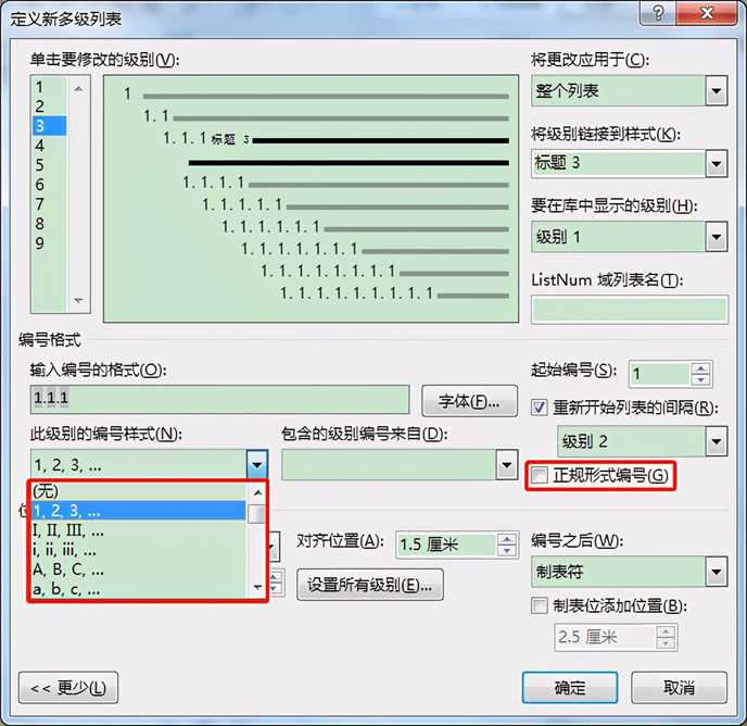 取消勾选窗口右侧“正规形式编号”选项,此时,“此级别的编号样式”编辑框下拉列表即可正常展开,我们根据需要选择相应的编号样式即可。