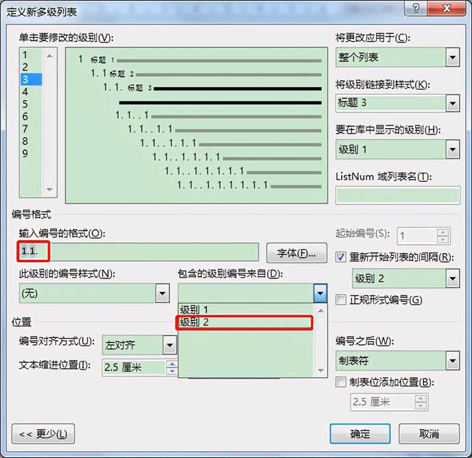 3. 按同样的方法,在“包含的级别编号来自”编辑框下拉列表中选择“级别2”,此时在“输入编号的格式”编辑框中会添加“级别2”的编号样式“1”,接着在其后面手动输入一个小黑点。