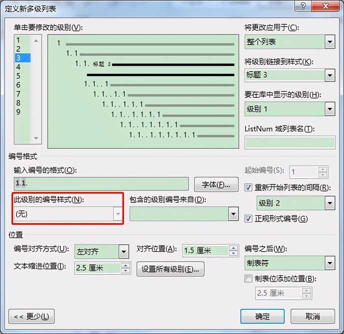 下图中,当前要设置“3”级编号样式,但是窗口中“此级别的编号样式”编辑框下拉列表无法展开进行选择或变更。