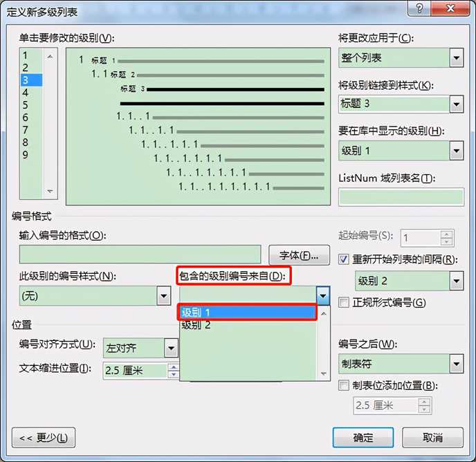 1. 在“包含的级别编号来自”编辑框下拉列表中选择“级别1”,此时“输入编号的格式”编辑框中会出现级别1的编号样式“1”。