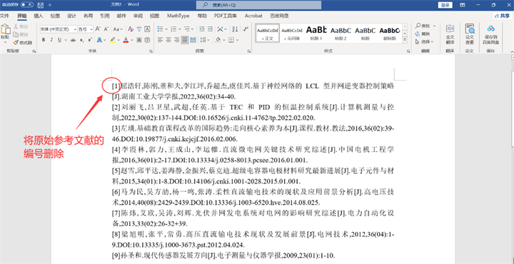 要想实现上面这种效果,需要在Word中对参考文献进行编辑,WPS也类似。首先需要将原始参考文献的编号删除,编辑的方法如下:
