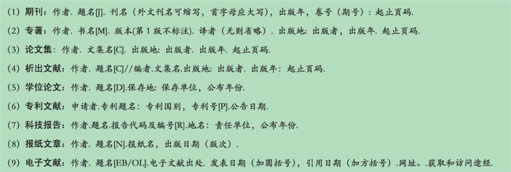 小编总结了9种常见的参考文献的标准引用形式,如下图所示
