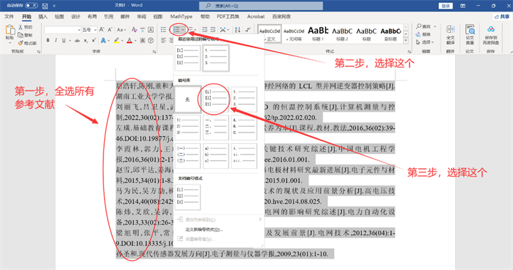 接下来进行下一步的操作,在Word中点击“格式编号”,选择参考文献的格式进行自动编号,如下所示: