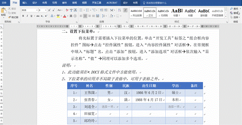 将光标置于需要插入下拉菜单的位置,单击“开发工具”标签之“组合框内容控件”图标–>点击“控件属性”按钮,进入“内容控件属性”对话框–>在常规框中填入“标题”名,点击“添加”按钮,进入“添加选项”对话框à依次输入“显示名称”、“值”–>同理可以添加多个选项。