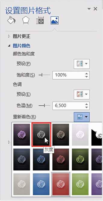 3.在“图片颜色”下面点击“重新着色”右侧的按钮,在弹出的列表中选择“灰度”样式。