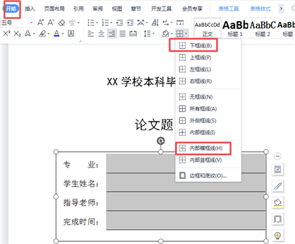 ⑨:选中表格中没有文字的列,点击【开始】——【边框】——【下框线】和【内部横框线】