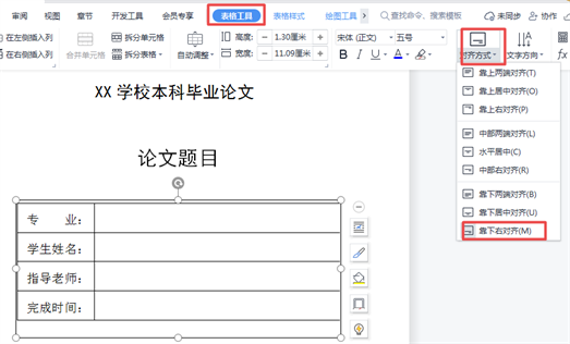 ⑦:点击菜单栏【表格工具】——【对齐方式】——【靠 下 右对齐】;
