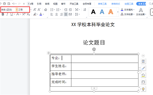 ⑥:在表格中输入对应的文字。例如:专业、姓名、指导老师以及完成时间。这里设置字体样式:宋体(正文)、三号