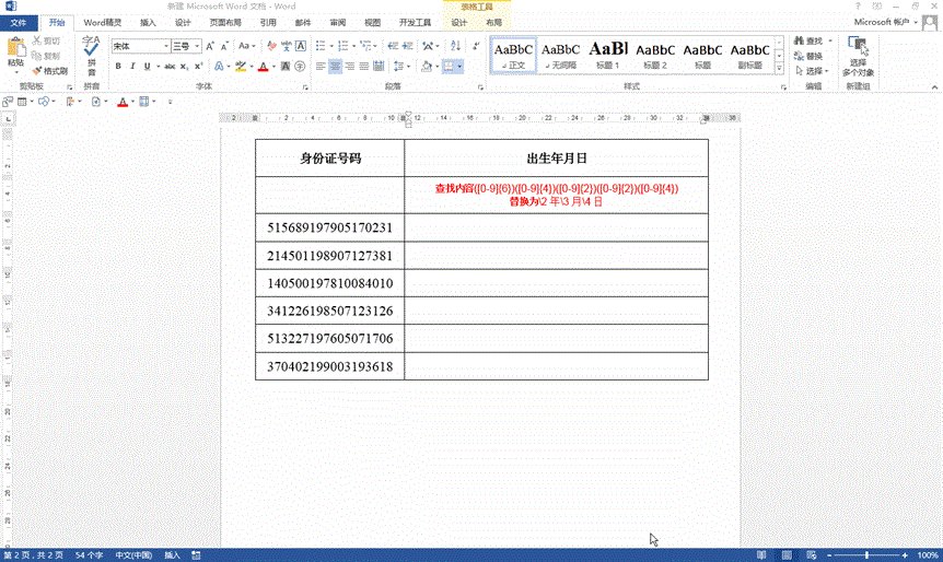 第二种方法是利用通配符,我们先把身份证号码复制出来一份,然后选中这一块内容,Ctrl+H打开替换窗格,在查找内容里面输入([0-9]{6})([0-9]{4})([0-9]{2})([0-9]{2})([0-9]{4}),它表示将指定内容划分为五个字段(一个括号表示一个字段),其中中括号表示字符区间,大括号表示字符数,小括号之间不用空格和其他标点符号,替换为输入“\2年\3月\4日”,数字表示第几个字段,后面表示单位,然后点击更多,在下面勾选“使用通配符”,然后确定就可以了,记得点“否”,不然的话其他部分的内容也被替换掉了。
