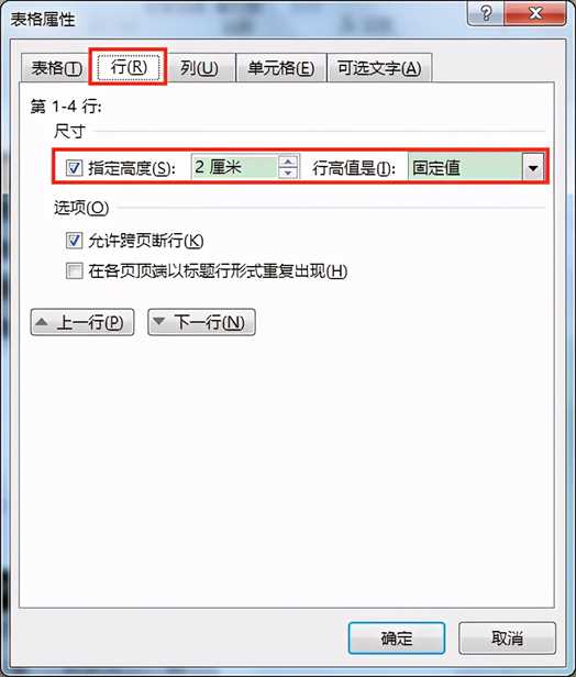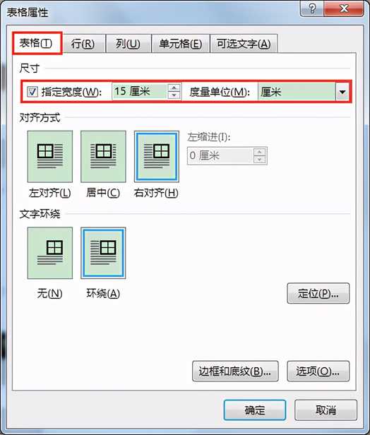 6.在弹出的“表格属性”对话框中,切换到“表格”选项卡,将“尺寸”设为“指定宽度”“15厘米”;再切换到“行”选项卡,将“尺寸”设为“指定高度”“2厘米”(行高值为固定值),单击“确定”按钮。