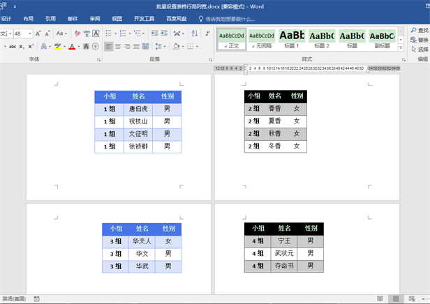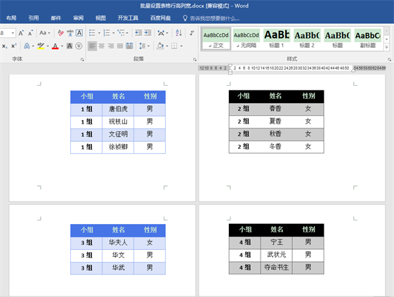 下图文档中有4个表格,表格的尺寸不一致,下面我们想将所有表格整体宽度设置为15厘米,表格每行行高设为2厘米。如果大家的文档中表格数量更多,下文中的代码也是可以使用的。