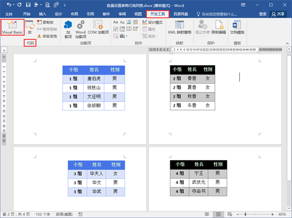 最佳答案下图文档中有4个表格,表格的尺寸不一致,下面我们想将所有表格整体宽度设置为15厘米,表格每行行高设为2厘米。如果大家的文档中表格数量更多,下文中的代码也是可以使用的。操作步骤:1.在文档窗口上方的“开发工具”选项卡“代码”功能组中单击“Visual Basic”按钮......