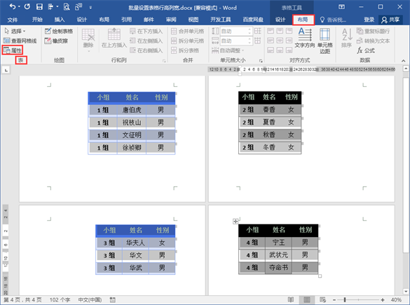 5.在“表格工具”“布局”选项卡“表”功能组中单击“属性”按钮。