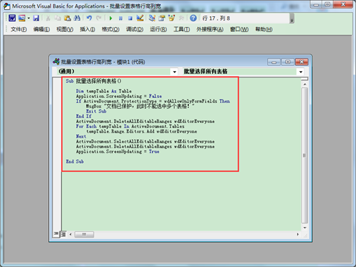 4.单击窗口上方工具栏中的“运行子过程/用户窗体”按钮(方向向右的绿色三角符号),这样所有文档中的表格都会被选中。