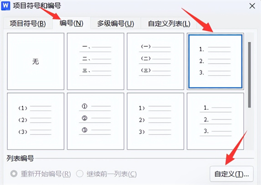 - 第2步:打开【项目符号和编号】对话框后,在【编号】选项中选择第一排的【1.2.3.】样式,随后点击【自定义】。