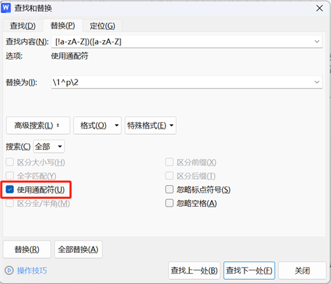 这是应对长篇文档最高效的处理方式。具体操作步骤为:按下Ctrl+H调出替换对话框,勾选【使用通配符】选项,在查找框输入“([!a-zA-Z])([a-zA-Z])”,替换框输入“\1^p\2”,最后点击“全部替换”即可。
