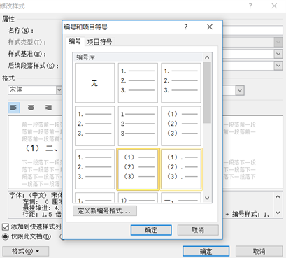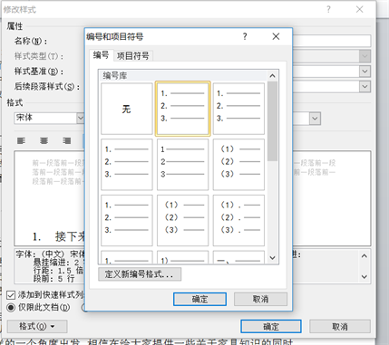 接下来就是设置标题序号,选择格式——编号,在弹出的对话框中找到自己需要的编号格式“1.”。