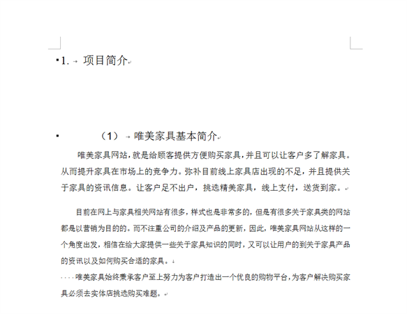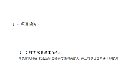 设置好后,将鼠标放在第一个一级标题“一、项目简介”上,鼠标点击样式中的“标题1”,则这个一级标题就按照要求修改了格式。同样的方式将全部一级标题修改好。