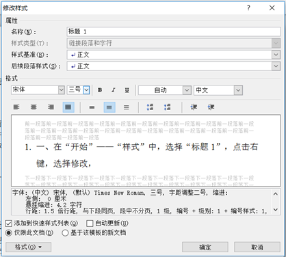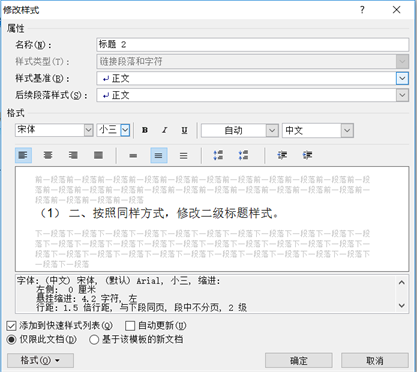 比如在下面的文档中,要把全部一级标题格式改为:三号、段前段后间距5行,标题序号格式为”1.”;二级标题格式改为小三号,段前后间距0,标题序号格式为(1);正文设置为1.5倍行距,首行缩进2字符,段落间距为0。