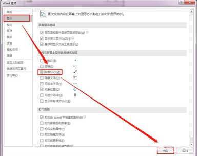 2、弹出“Word选项”对话框 — 切换到“显示”选项卡 — 取消勾选“段落标记”– 点击“确定”按钮即可。