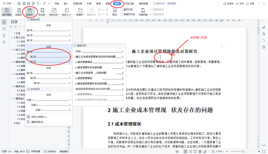 1、单击想插入目录的位置,键入光标闪动 2、点击工具栏的【章节】3、单击【目录页】,出现”智能目录” 4、鼠标移动到不同的”智能目录”可预览样式 5、单击选择自己想要的样式(也可以选择“自定义目录”)