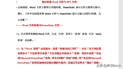 最佳答案操作步骤1、打开需要转换的Word文件,点击“文件”菜单之“选项”选项,打开“word选项”对话框。2、在“Word选项”对话框中,选择“快速访问工具栏”,并在“从下列位置选择命令”下拉菜单中选择“不在功能区中的命令”选项,列表中选择“发送到Microsoft PowerPoint......