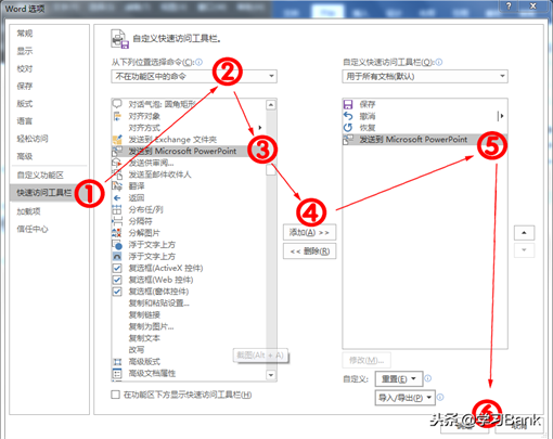 2、在“Word选项”对话框中,选择“快速访问工具栏”,并在“从下列位置选择命令”下拉菜单中选择“不在功能区中的命令”选项,列表中选择“发送到Microsoft PowerPoint”选项,单击中间的“添加”按钮,将“发送到Microsoft PowerPoint”选项添加到对话框右侧的方框内,添加完毕后单击“确定”按钮。