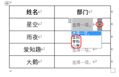 将鼠标定位到需要设置下拉菜单的位置,在【开发工具】选项卡下【控件】组中点【下拉列表内容控件】