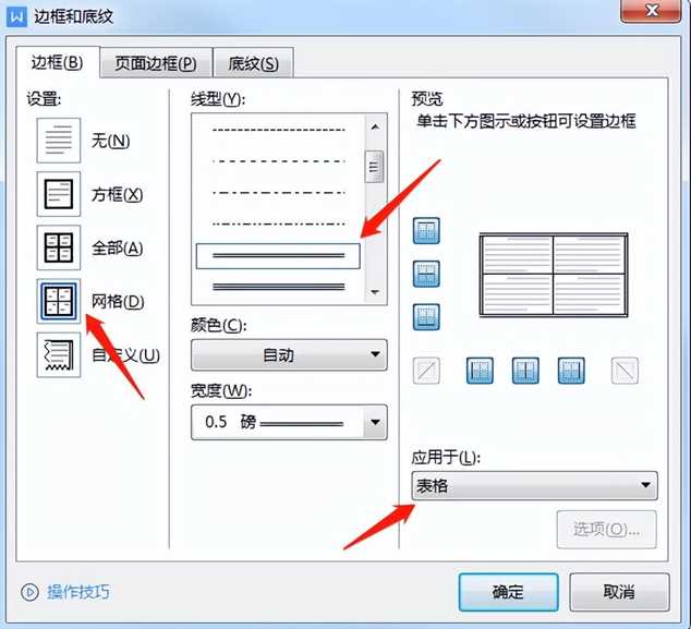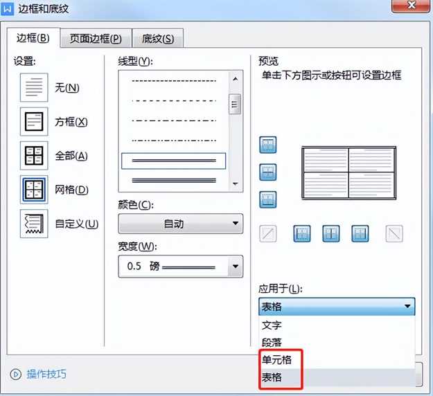 设置:选择网格;线型:找到双细线;颜色宽度根据需要选择,应用于哪里需要说明一下,如第二张图,就有单元格和表格选项,容易让人分不清楚。