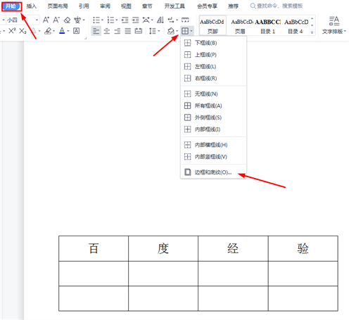 选中目标表格→菜单栏点开始→边框→边框和底纹