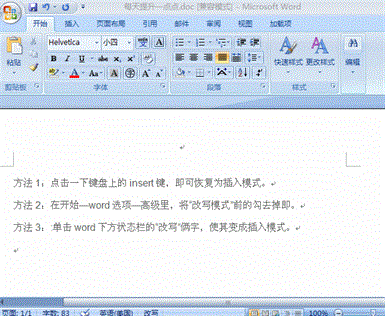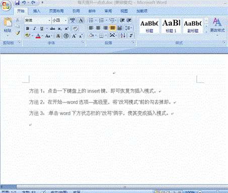 方法2:在开始—word选项—高级里,将“改写模式”前的勾去掉即可。