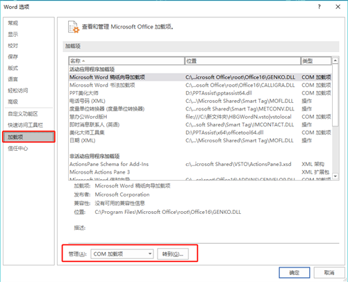 在Word选项中,点击【加载项】,找到【管理COM加载项】选项,点击【转到】。