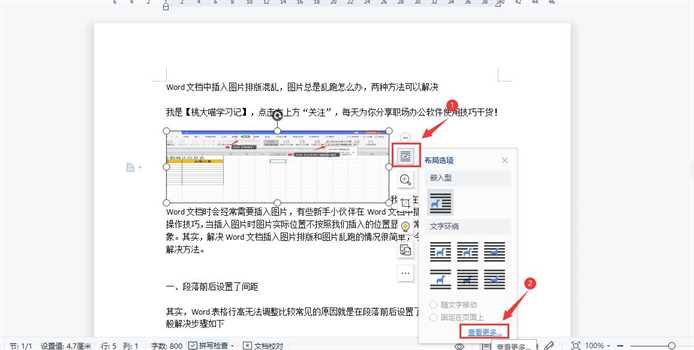 2、我要把这个图片放到第二段文字的中间位置,然后点击图片,点击右侧的【布局选项】-【查看更多】,如下图