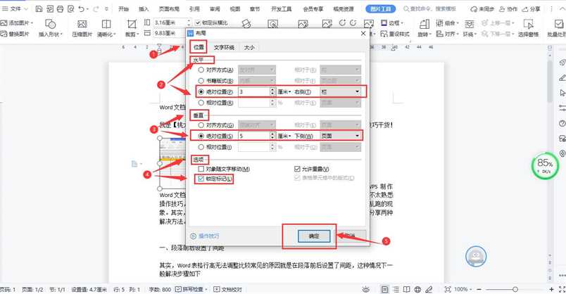 4、然后点击【位置】,水平绝对位置填写3厘米(根据实际情况填写数值),右侧选择:栏;垂直绝对位置填写5厘米(根据实际情况填写数值),下侧选择:页面;选择选择:锁定。其实这一步设置就是通过布局的绝对位置来固定图片的位置,水平和垂直的具体数值需要根据具体排版的需要设置,如下图所示