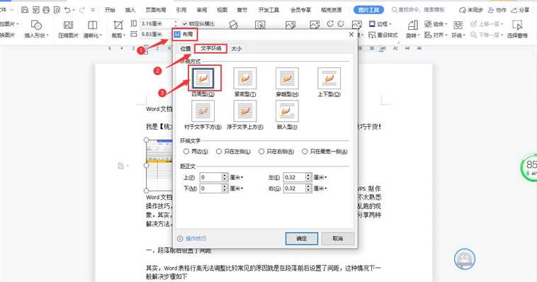 3、在弹出的“布局”对话框中,文字环绕选择:四周型(备注可以根据自己的实际情况选择),如下图