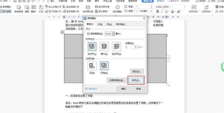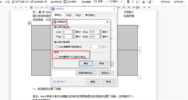 4、在弹出的“表格属性”对话框中,点击【选项】,然后在“表格选项”对话框中的“选项”位置,把“自动重调尺寸以适应内容”前面的对勾去掉,最好确认,这样表格尺寸就不会因为添加的图片尺寸大小改变了,如下图