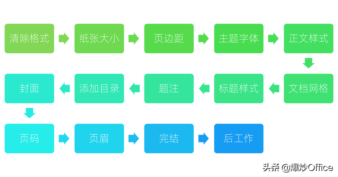 排版流程大体可以概况如下:1.清除格式→2.纸张大小→3.页边距→4.主题字体→5.正文样式→6.文档网格→7.标题样式→8.题注→9.添加目录→10.封面→11.页码→12.页眉→13.完结→14.后工作。