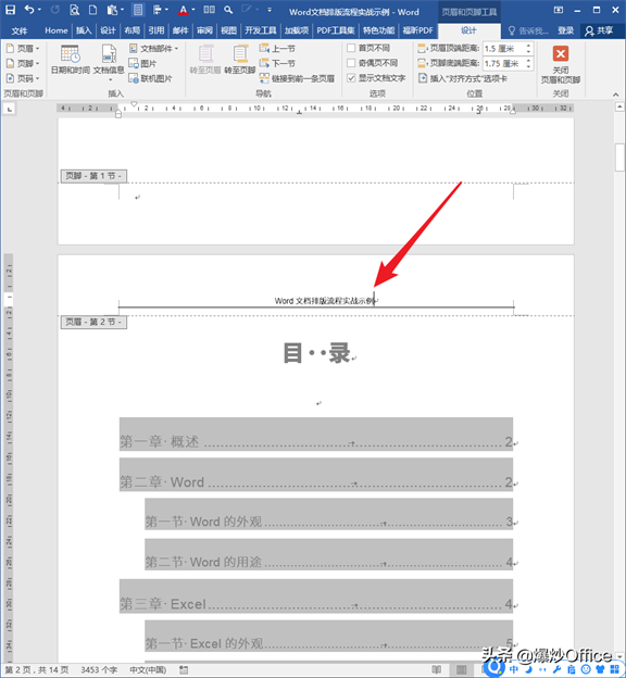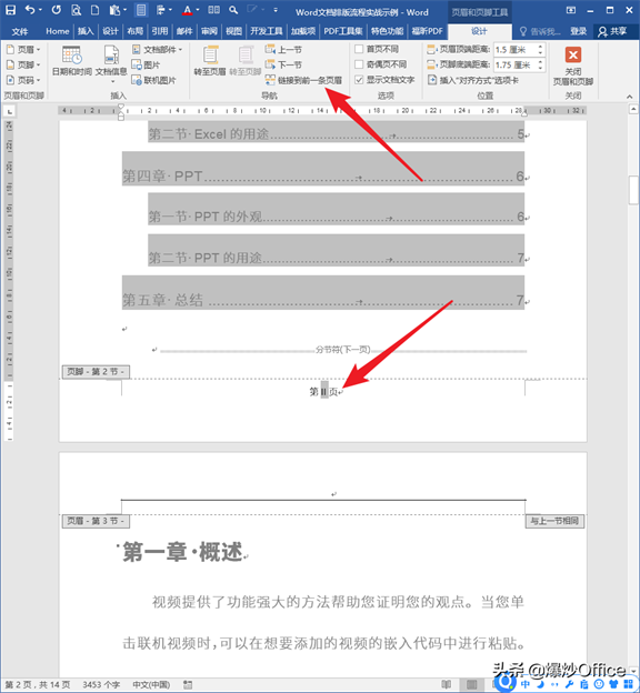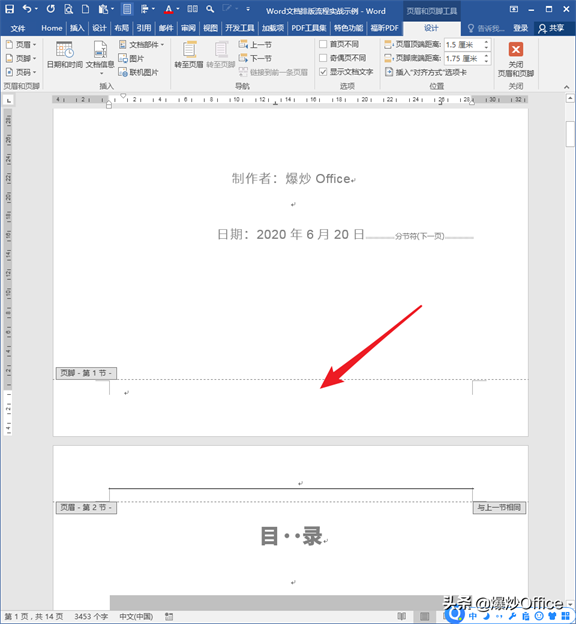 从这里,就能回答之前的所有问题了。因为封面、目录都是使用分节符的方式插入的页,所以封面、目录、正文都是相对独立的节,可以设置不同的页脚和页眉。